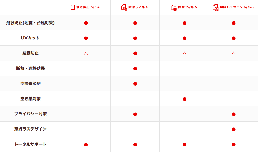 全てのフィルムに表面が傷つきにくいハードコート層があります。また、全てのフィルムはJIS A5759 A法B法適合商品です。